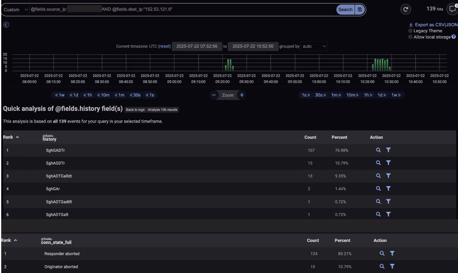 Additionally, the Darktrace SOC team was able to validate the effectiveness of the Autonomous Response actions by analyzing connections to 152.53.121[.]6 using the Advanced Search feature. Across more than 130 connection attempts, Darktrace’s SOC confirmed that all were aborted, meaning no connections were successfully established.