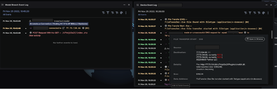 Various Amadey activities were detected and highlighted in DETECT model breaches and their model breach event logs. Figure 3 shows a compromised device making suspicious HTTP POST requests, causing the ‘Anomalous Connection / Posting HTTP to IP Without Hostname’ model to breach. It also downloaded an executable file (.exe) from the same IP.