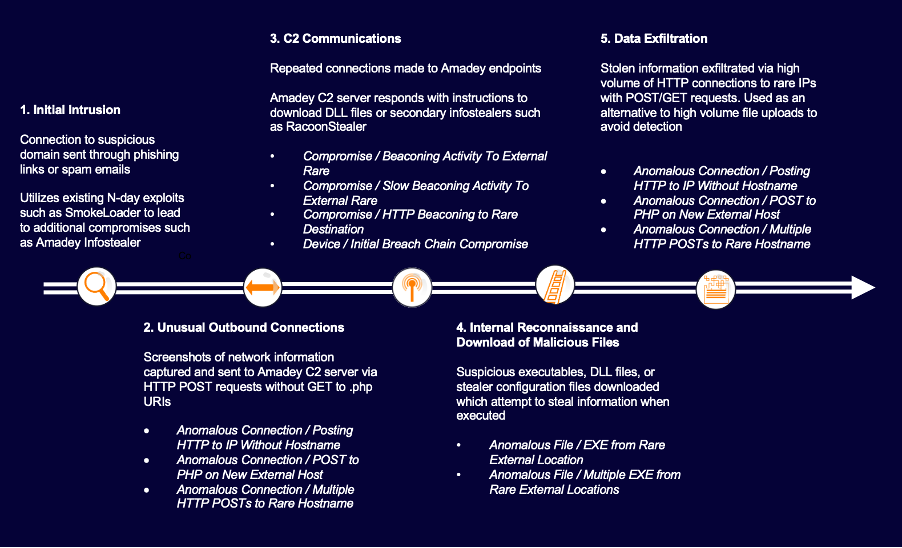 The presence of the Amadey info-stealer in multiple customer environments highlights the continuing prevalence of MaaS and info-stealers across the threat landscape. The Amadey info-stealer in particular demonstrates that by evading N-day vulnerability patches, threat actors routinely launch new attacks. These malicious actors are then able to evade detection by traditional security tools by employing low and slow data exfiltration techniques, as opposed to large file transfers.