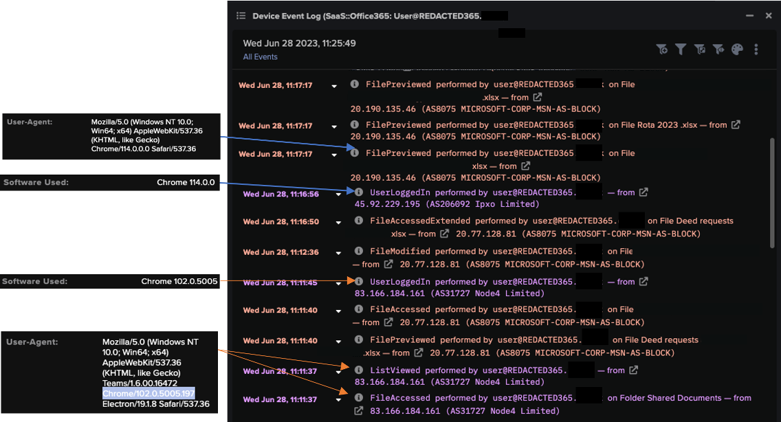 Following the anomalous ExpressVPN login, Darktrace detected further account anomalies originating from another ExpressVPN IP (45.92.229[.]195), as the attacker accessed files over SharePoint. Notably, Darktrace identified that the logins from ExpressVPN IPs were performed with the software Chrome 114, however, activity from the legitimate account owner prior to these unusual logins was performed using the software Chrome 102. It is unusual for a user to be using multiple browser versions simultaneously, therefore in addition to the observed impossible travel, this further implied the presence of different actors behind the simultaneous account activity.