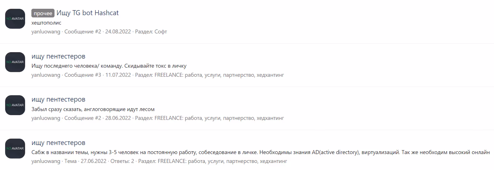 By searching through XSS.Is we managed to identify the user registered as @yanluowang. The date of the registration on the forum dates to 15 March 2022. Curiously, at the time of analysis, we noticed the user was online. There were in total 20 messages posted by @yanluowang, with a few publications indicating the group is looking for new pentesters.