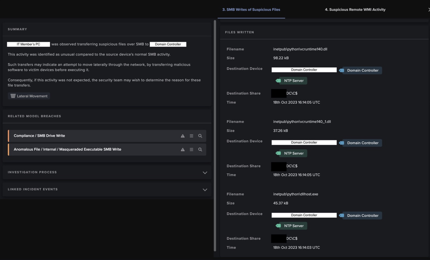 An addition to DETECT’s identification of this unusual activity, Darktrace’s Cyber AI Analyst launched an autonomous investigation into the ongoing compromise and was able to link the SMB writes and the sharing of the executable Python payloads, viewing the connections as one lateral movement incident rather than a string of isolated events. After completing its investigation, Cyber AI Analyst was able to provide a detailed summary of events on one pane of glass, ensuring the customer could identify the affected device and begin their remediation.