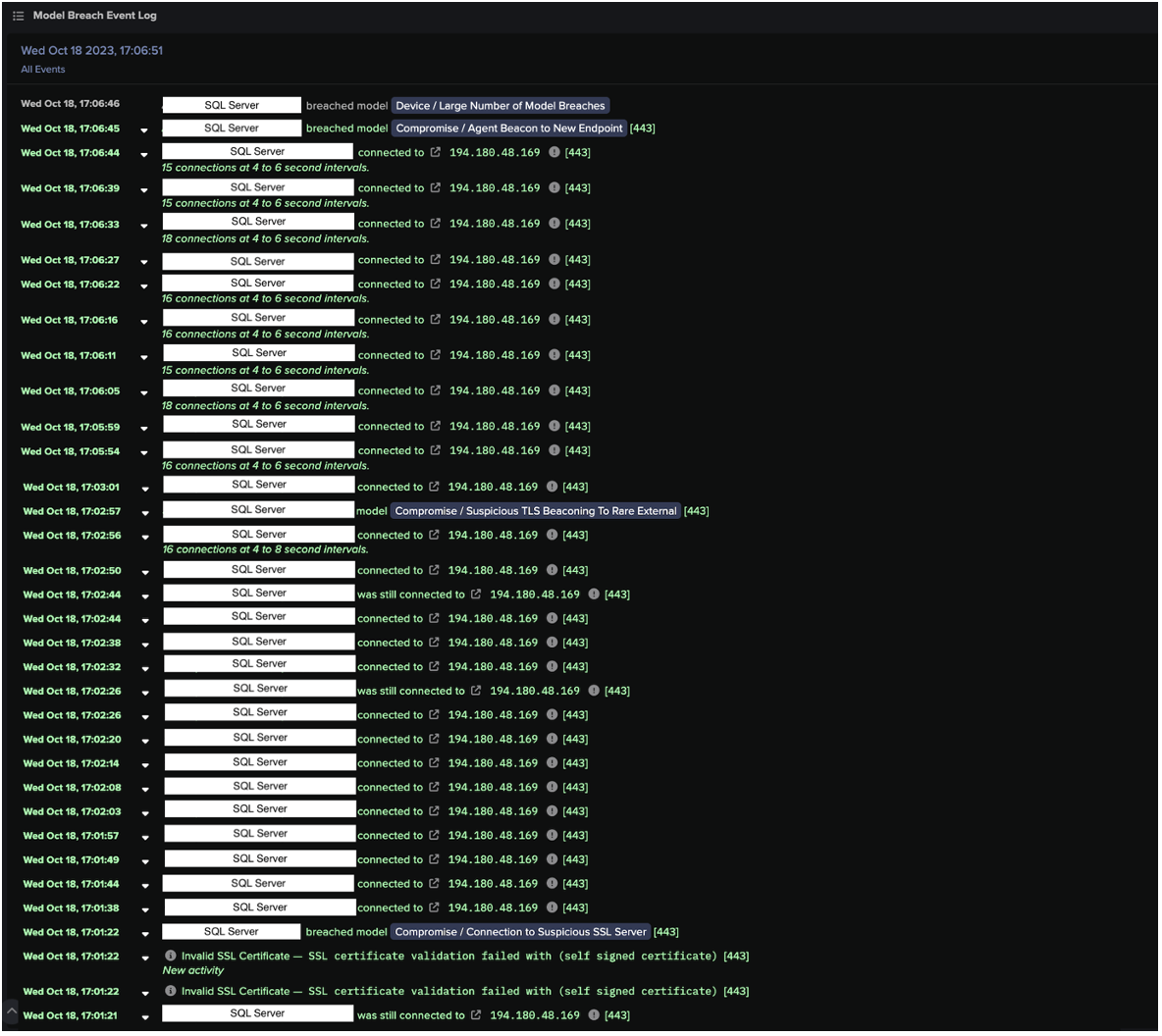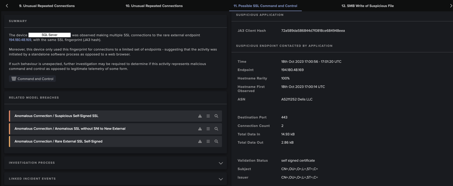 Once more, Cyber AI Analyst launched its own investigation into this activity and was able to successfully identify a series of separate SSL connections, linking them together into one wider C2 incident.