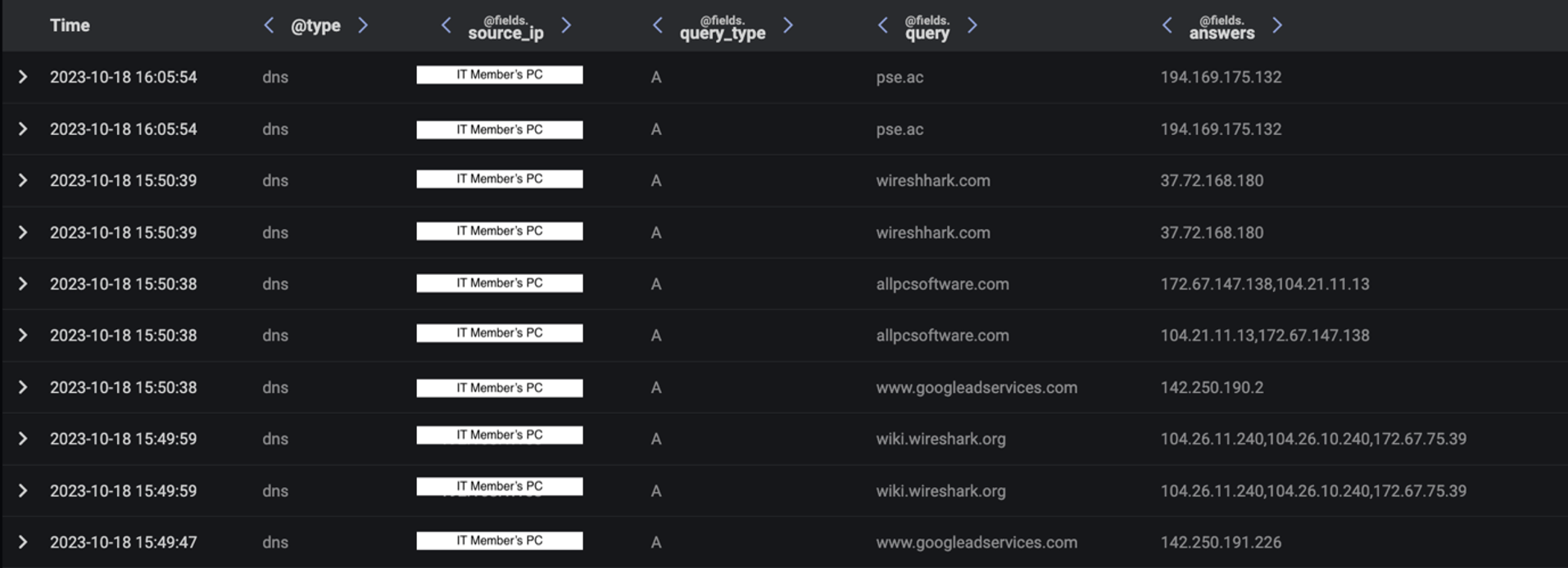 Initially, Darktrace observed the device making type A DNS requests for 'wiki.wireshark[.]org' immediately before making type A DNS requests for the domain names 'www.googleadservices[.]com', 'allpcsoftware[.]com', and 'wireshhark[.]com' (note the two 'h's). This pattern of activity indicates that the device’s user was redirected to the website, wireshhark[.]com, as a result of the user's interaction with a sponsored Google Search result pointing to allpcsoftware[.]com.