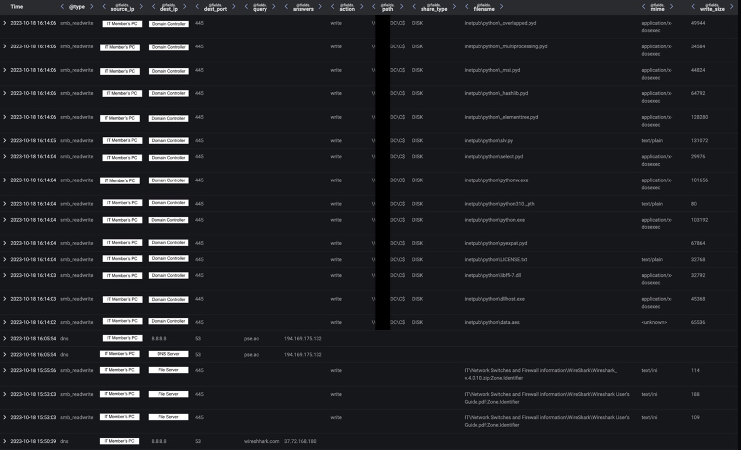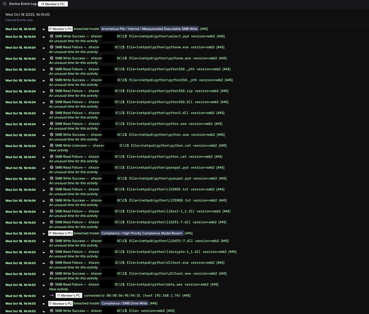 Since the malicious actor had gained control of an IT member's device, they were able to abuse the privileged account credentials to spread Python payloads across the network via SMB and the Windows Management Instrumentation (WMI) service. The actor was also seen distributing the Windows Sys-Internals tool, PsExec, likely in an attempt to facilitate their lateral movement efforts. It was normal for this IT member's desktop to distribute files across the network via SMB, which meant that this malicious SMB activity was not, at first glance, out of place.