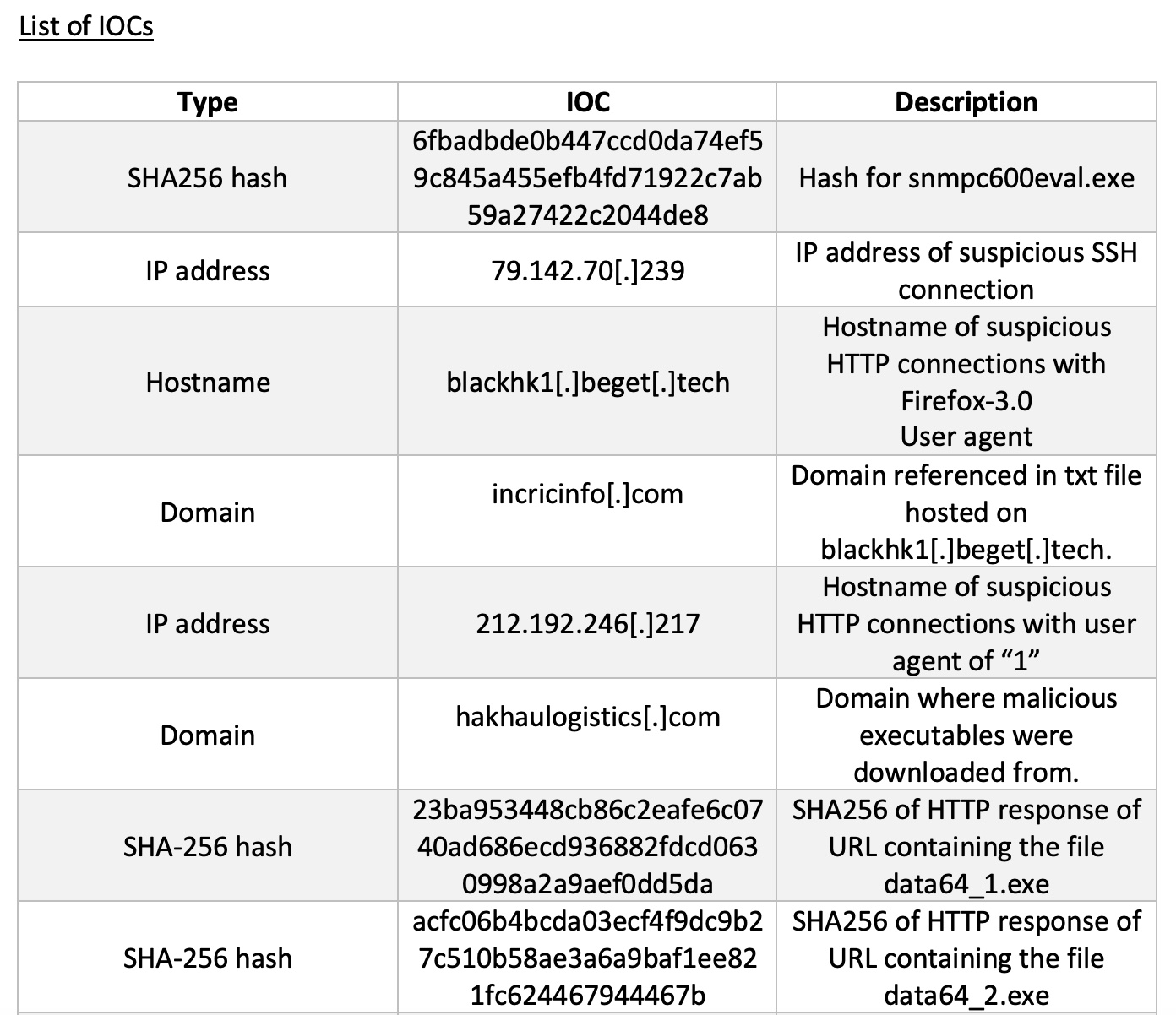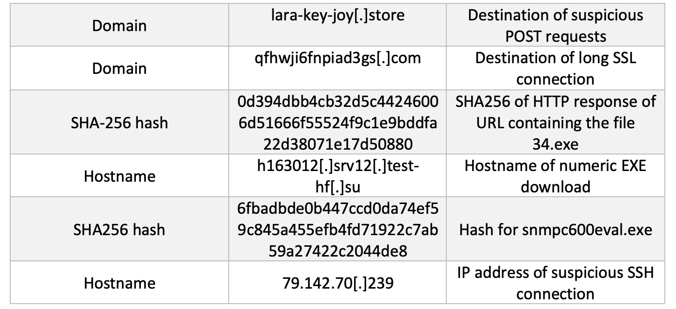 Whilst the RedLine compromise was a matter of customer concern, the gap in their security was not visibility but rather best practice. It is important to note that prior to these events, the device was commonly seen sending and receiving connections associated with torrenting. In the past it has been observed that RedLine Stealer masquerades as ‘cracked’ software (software that has had its copy protection removed) [6]. In this instance, the initial download of the false ‘SNMPc’ executable may have been proof of this behavior.