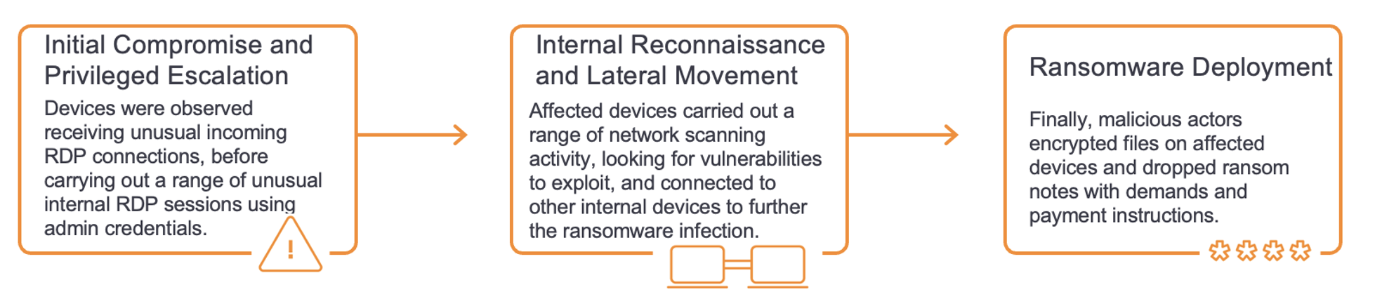 Figure 1 shows how Darktrace detected one of those internal devices failing to login via SMB multiple times with a certain credential (indication of a possible SMB/NTLM brute force), before successfully accessing other internal devices via SMB, NTLM and RDP using the likely compromised administrative credential mentioned earlier.