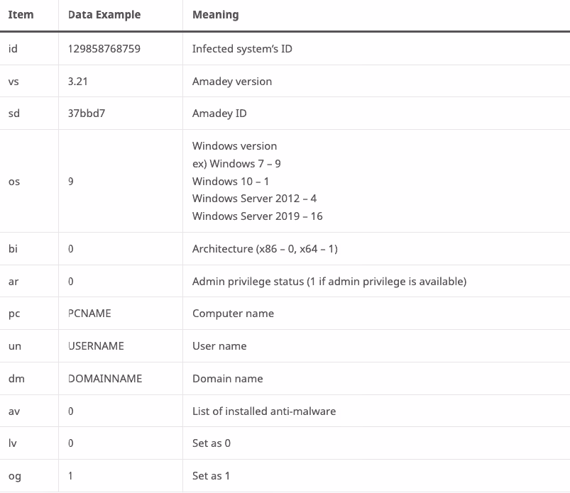 Further information about the infected system can be seen in the above PCAP. As outlined by researchers at Ahnlab and shown in Figure 5, additional system information sent includes the Amadey version (vs=), the device’s admin privilege status (ar=), and any installed anti-malware or anti-virus software installed on the infected environment (av=) [3].