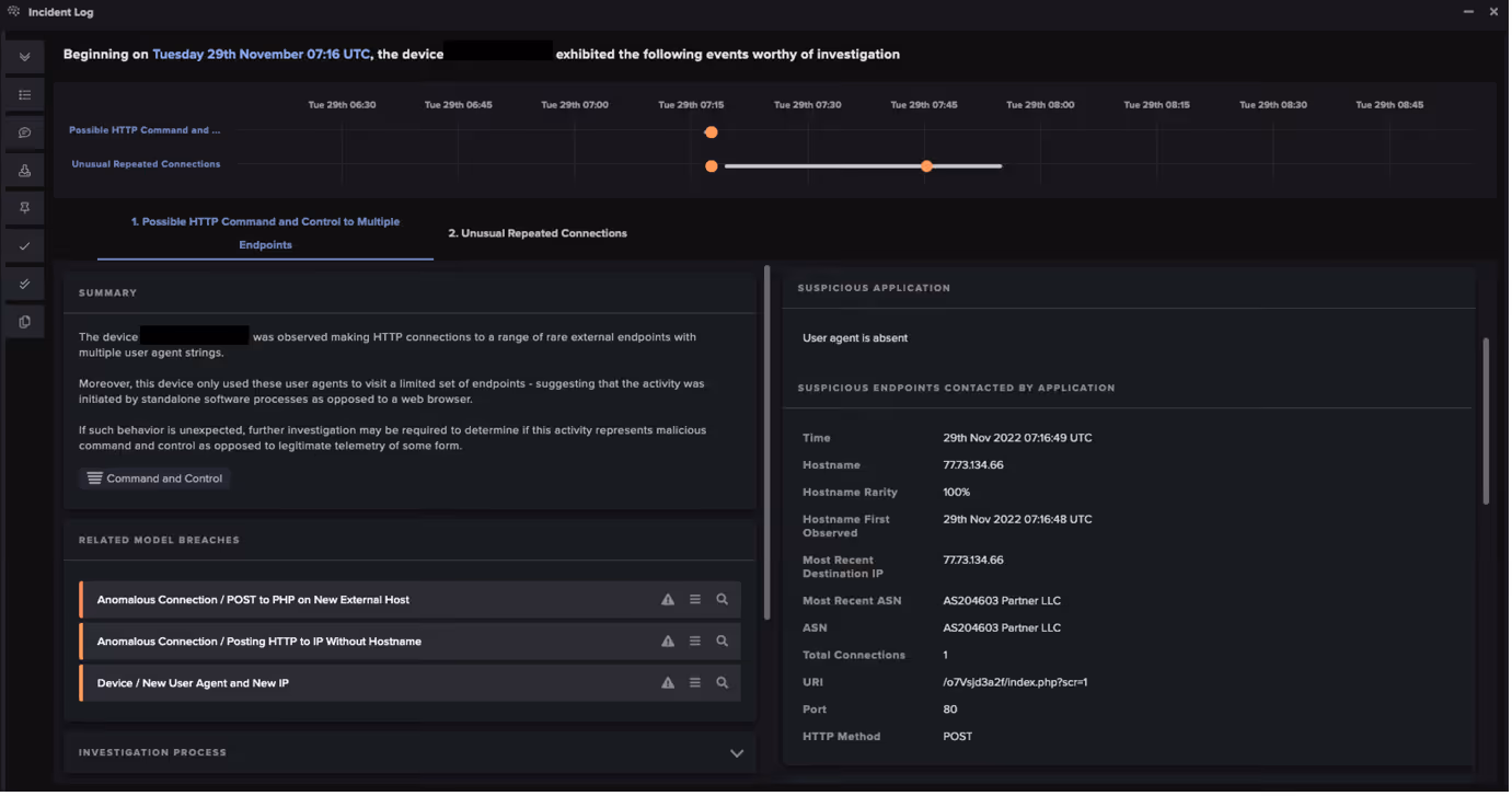 On one customer’s environment, a device made a POST request with no GET to URI ‘/p84Nls2/index.php’ and unepeureyore[.]xyz. RESPOND autonomously enforced a previously established pattern of life on the device twice for 30 minutes each and blocked all outgoing traffic from the device for 10 minutes. Enforcing a device’s pattern of life restricts it to conduct activity within the device and/or user’s expected pattern of behavior and blocks anything anomalous or unexpected, enabling normal business operations to continue. This response is intended to reduce the potential scale of attacks by disrupting the kill chain, whilst ensuring business disruption is kept to a minimum.