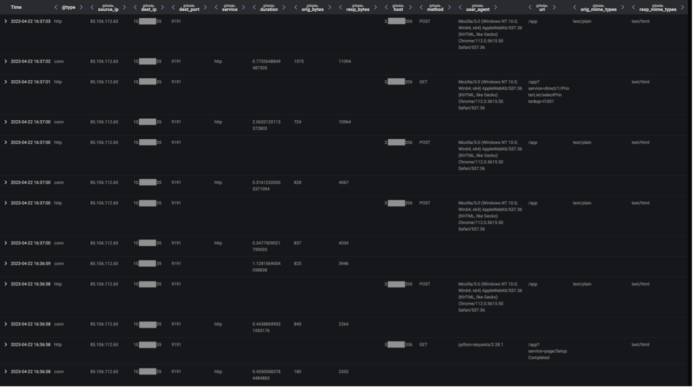 Both attack chains started with highly unusual external endpoints contacting the '/SetupCompleted' endpoint of an Internet-facing PaperCut server. These requests to the ‘/SetupCompleted’ endpoint likely represented attempts to exploit CVE-2023–27350 [10]. 50.19.48[.]59 chains started with exploit connections from the external endpoint, 85.106.112[.]60, whereas 192.184.35[.]216 chains started with exploit connections from Tor nodes, such as 185.34.33[.]2.