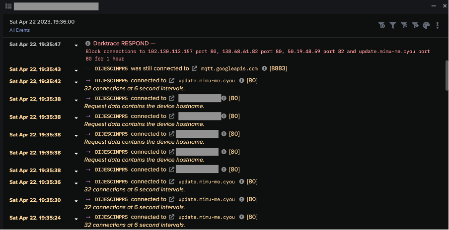 Darktrace RESPOND™ was not active in any of the networks affected by 192.184.35[.]216 activity, however, RESPOND was active in some of the networks affected by 50.19.48[.]59 activity. In those environments where RESPOND was enabled in autonomous mode, observed malicious activities resulted in intervention from RESPOND, including autonomous actions like blocking connections to specific external endpoints, blocking all outgoing traffic, and restricting affected devices to a pre-established pattern of behavior.