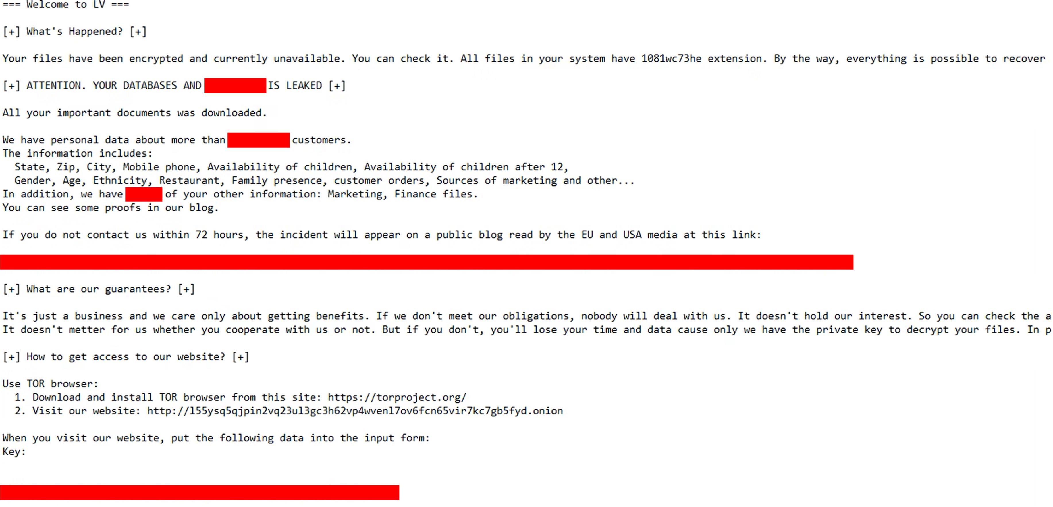 Figure 2: Capture of LV ransom note provided by customer