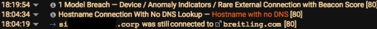 In addition to beaconing to the DGA-domains, the device made several hundred HTTP POST requests using the hostnames sixt.com and breitling.com. Both domains are rather well-known and no public record exists of these domains having been compromised. The HTTP POST requests were made without prior GET requests and continued for several days – this is highly unusual behavior and does not resemble a user browsing those websites.