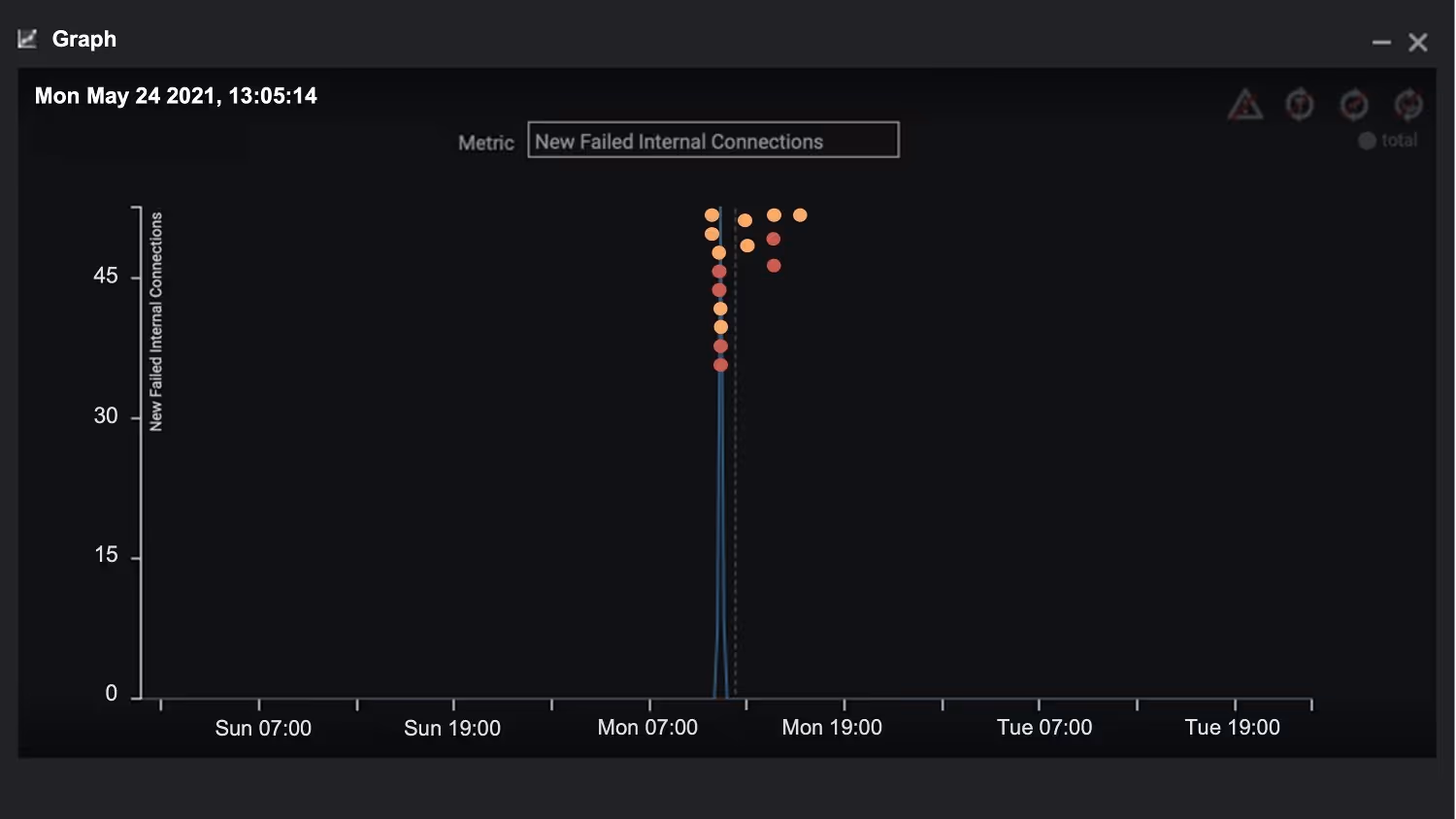 Figure 3: New failed internal connections performed by an initially infected desktop, in a similar incident. The graph highlights a surge in failed internal connections and model breaches.