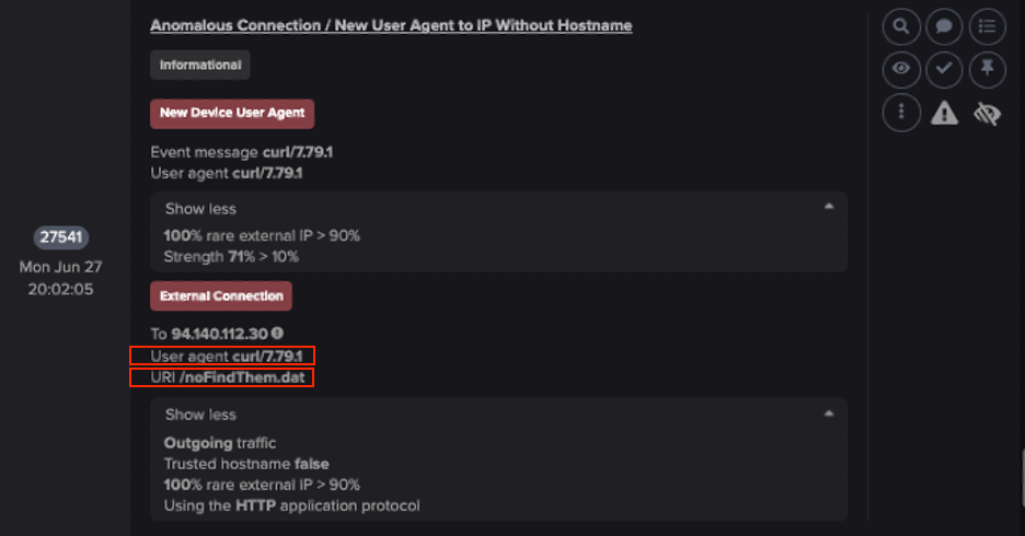 These DETECT models were able to capture the unusual usage of Office and cURL User-Agent strings on affected devices, as well as the downloads of the Qakbot DLL from rare external endpoints. These models look for unusual activity that falls outside a device’s usual pattern of behavior rather than for activity involving User-Agent strings, URIs, files, and external IPs which are known to be malicious.