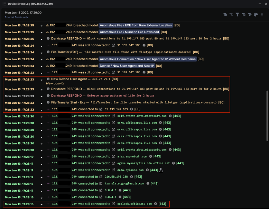 Figure 4: The Event Log for an infected device highlights the moment a connection to the endpoint outlook.office365[.]com was made. This was followed by an executable file transfer detection and use of a new User-Agent, curl/7.9.1