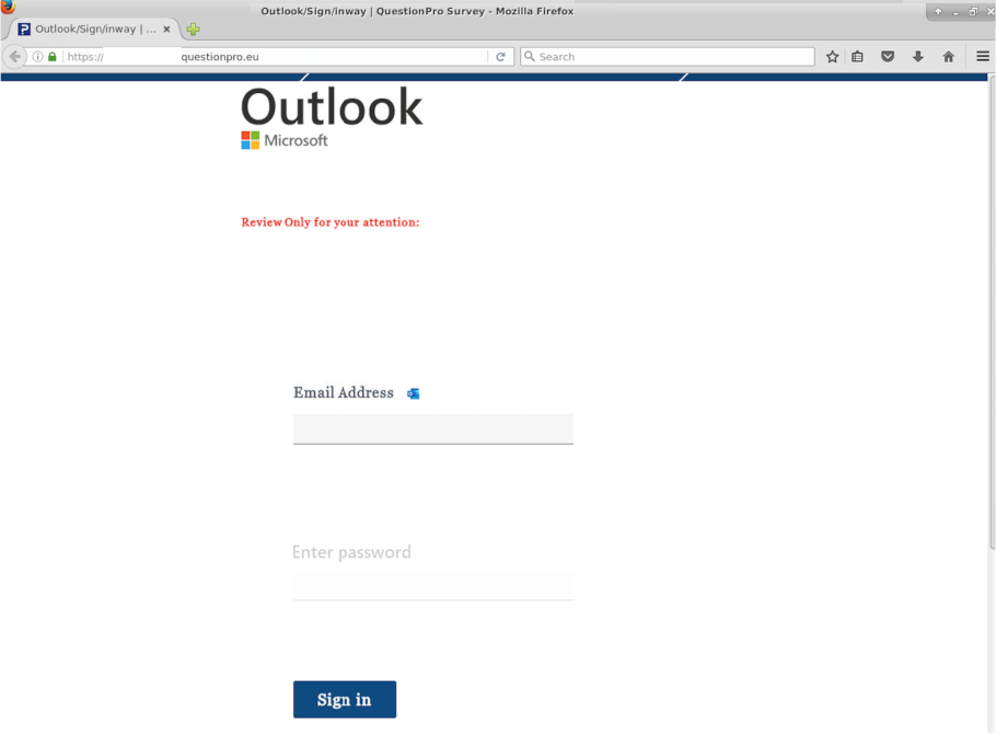 On February 3, the attacker sent a phishing email to the corporate account of an employee. The email was sent from the corporate account of an employee at a company with business ties to the victim enterprise. It is likely that the attacker had compromised this account prior to sending the phishing email from it. The phishing email in question claimed to be an overdue payment reminder. Within the email, there was a link hidden behind the display text “view invoice”. The hostname of the phishing link’s URL was a subdomain of questionpro[.]eu — an online survey platform. The page referred to by the URL was a fake Microsoft Outlook login page.