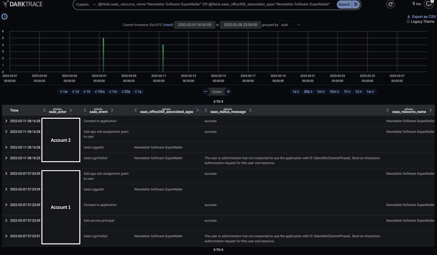 On February 11, the customer submitted an Ask the Expert (ATE) request to Darktrace’s SOC team. The guidance provided by the SOC helped the security team to contain the intrusion. The attacker managed to maintain a presence within the organization’s email environment for eight days. During these eight days, the attacker sent out large volumes of phishing emails from two corporate accounts. Before sending out these phishing emails, the attacker carried out predictable, preparatory actions. These actions included registering a mass-mailing application with Azure AD and creating an inbox rule.
