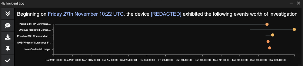 Figure 2: Cyber AI Analyst triaged and reported on the malicious activity from the device, surfacing useful metrics and natural language summaries for each stage of the kill chain.