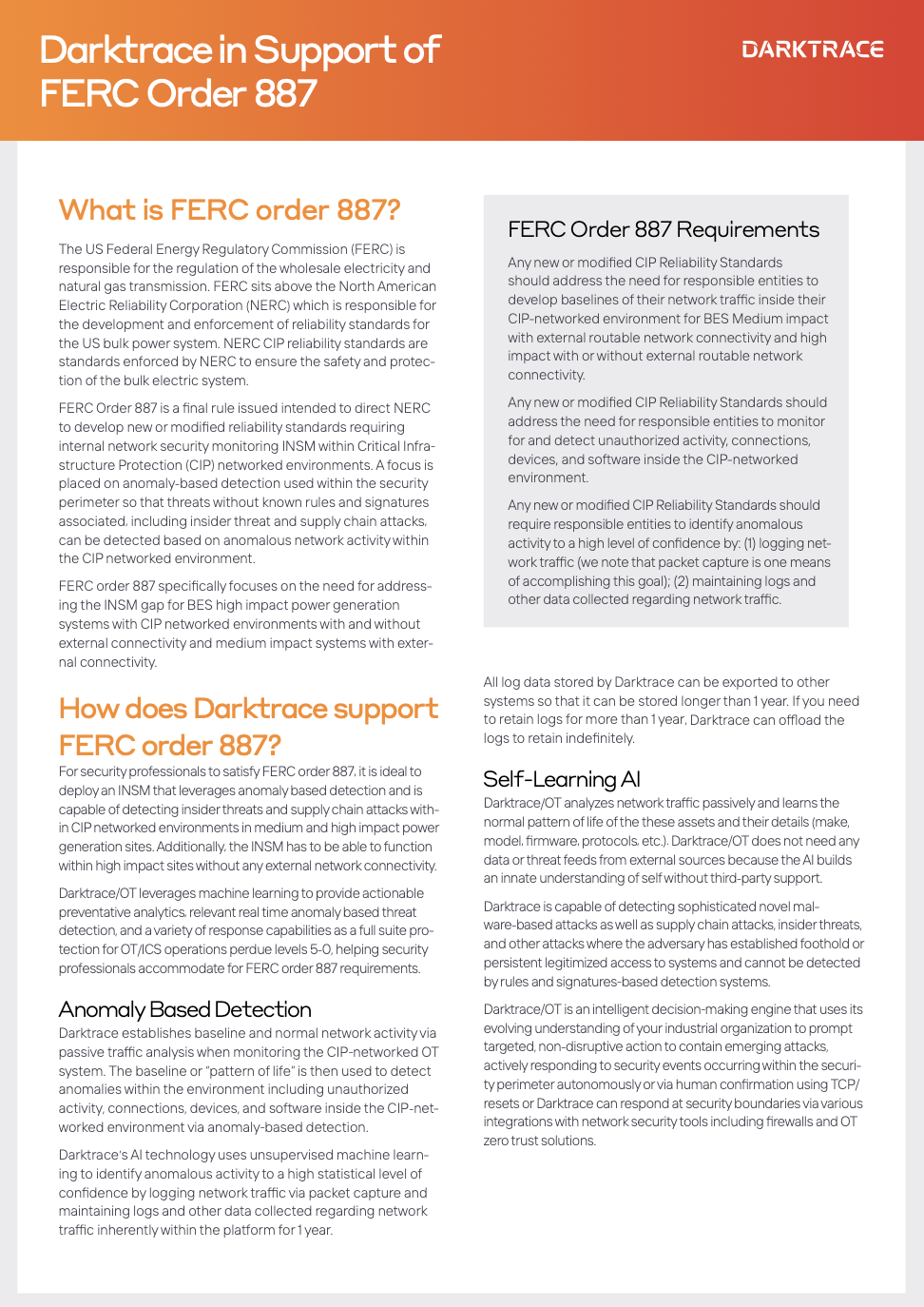Darktrace in Support of FERC Order 887
