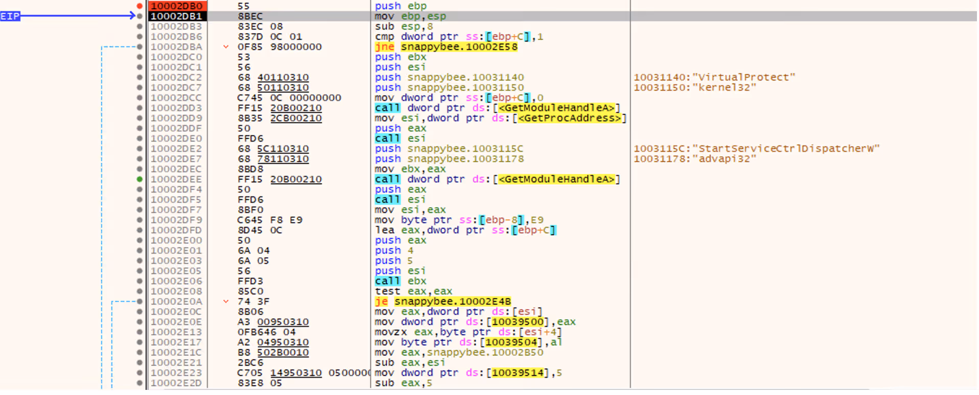 SnappyBee then uses the GetModule and GetProcAddress to dynamically resolve the address of the VirtualProtect in kernel32 and StartServiceCtrlDispatcherW in advapi32. Resolving these dynamically at runtime prevents them from showing up as a static import for the module, which can help evade detection by anti-malware solutions. Different regions of memory have different permissions to control what they can be used for, with the main ones being read, write, and execute. VirtualProtect is a function that changes the permissions of a given memory region.