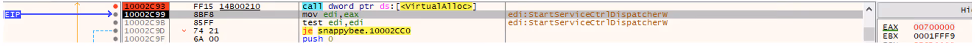 In practice, this means when the legitimate executable calls StartServiceCtrlDispatcherW, it will immediately hand execution back to SnappyBee. Meanwhile, the call stack now appears more legitimate to outside observers such as antimalware solutions.
