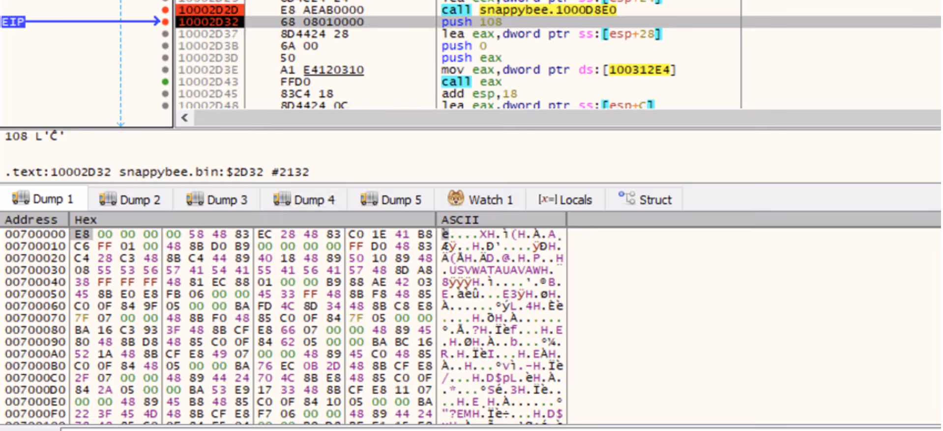 This is straightforward in this case, as the unpacking routine in relatively simple and would not require much effort to re-implement. However, many unpacking routines are far more complex, which leads to the second method: allowing the malware to unpack itself by debugging it and then capturing the result. This is the approach many analysts take to unpacking, and the following will document this method to unpack SnappyBee.