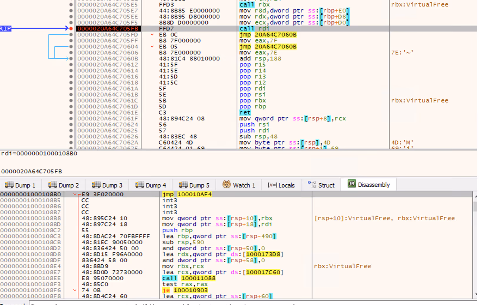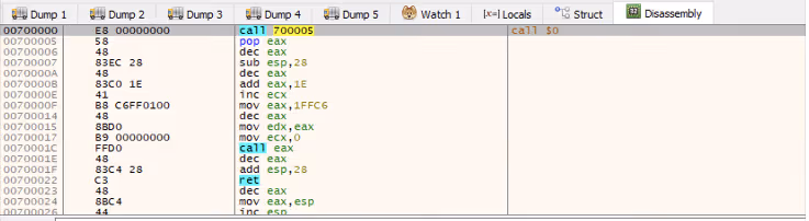 The simplest way to proceed is to single-step through the code, pausing on each call instruction to consider its purpose. Eventually, a call instruction that points to one of the memory regions that were assigned will be reached, which will contain the next layer of unpacked code. Using the same disassembly technique as before, it can be confirmed that this is more unpacked shellcode.