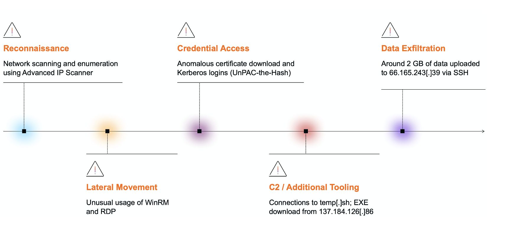 By compromising multiple credentials, the threat actor likely aimed to escalate privileges and facilitate further malicious activity, including lateral movement. One of the credentials obtained via the “UnPAC the hash” technique was later observed being used in an RDP session to the domain controller (REDACTED-dc2).