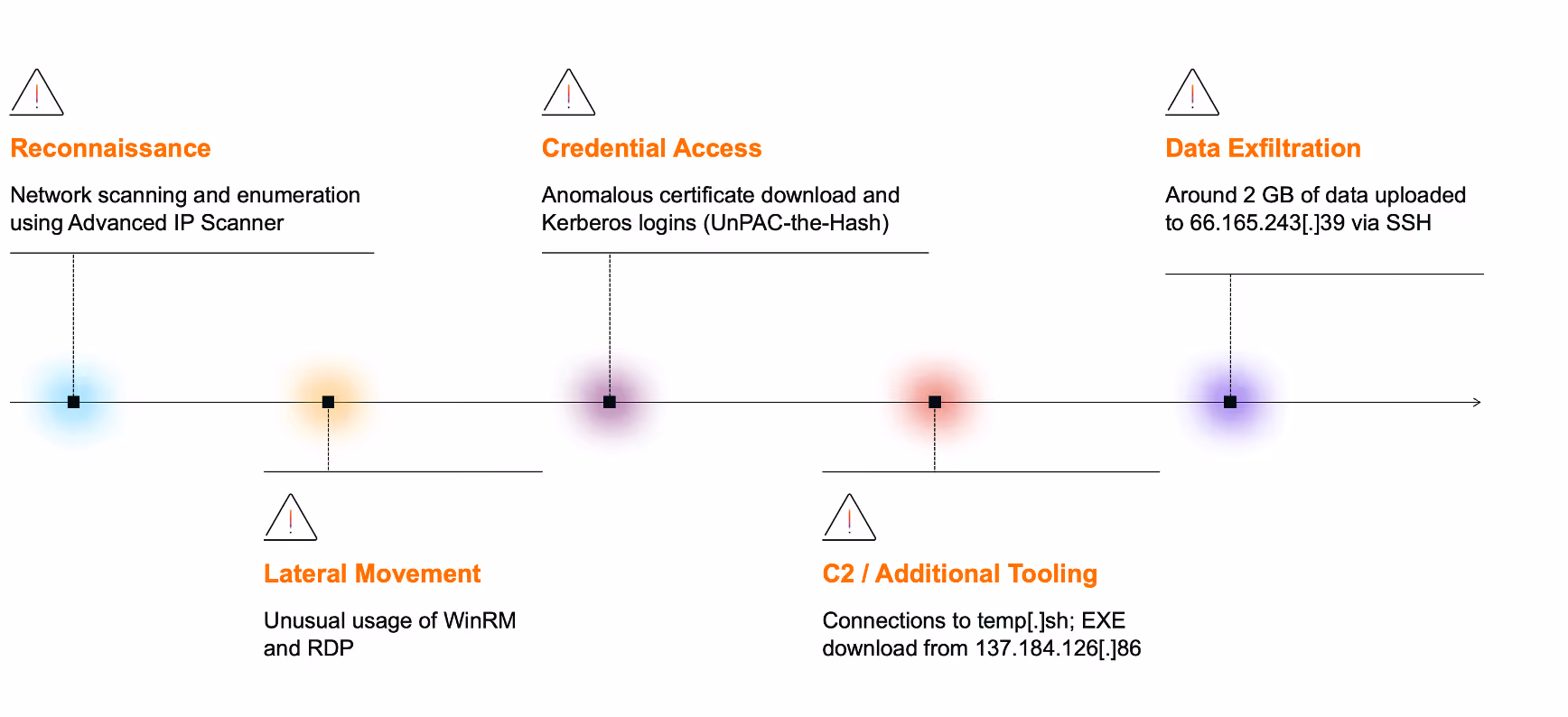 By compromising multiple credentials, the threat actor likely aimed to escalate privileges and facilitate further malicious activity, including lateral movement. One of the credentials obtained via the “UnPAC the hash” technique was later observed being used in an RDP session to the domain controller (REDACTED-dc2).