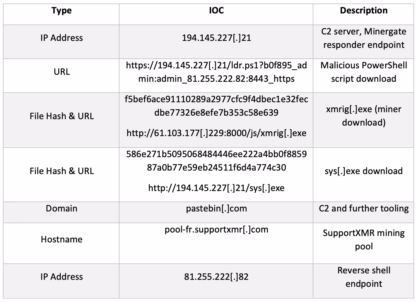 From 19:44:36 UTC onwards, the device performed cryptocurrency mining using the Minergate mining pool protocol to generate profits for the attacker. A login credential called ‘x’ was observed in the Minergate connections to ‘194.145.227[.]21’ via port 5443. JSON-RPC methods of ‘login’ and ‘submit’ were seen from the connection originator (the infected breach device) and ‘job’ was seen from the connection responder (the C2 server). A high volume of connections using the JSON-RPC application protocol to ‘pool-fr.supportxmr[.]com’ were also made on port 80.