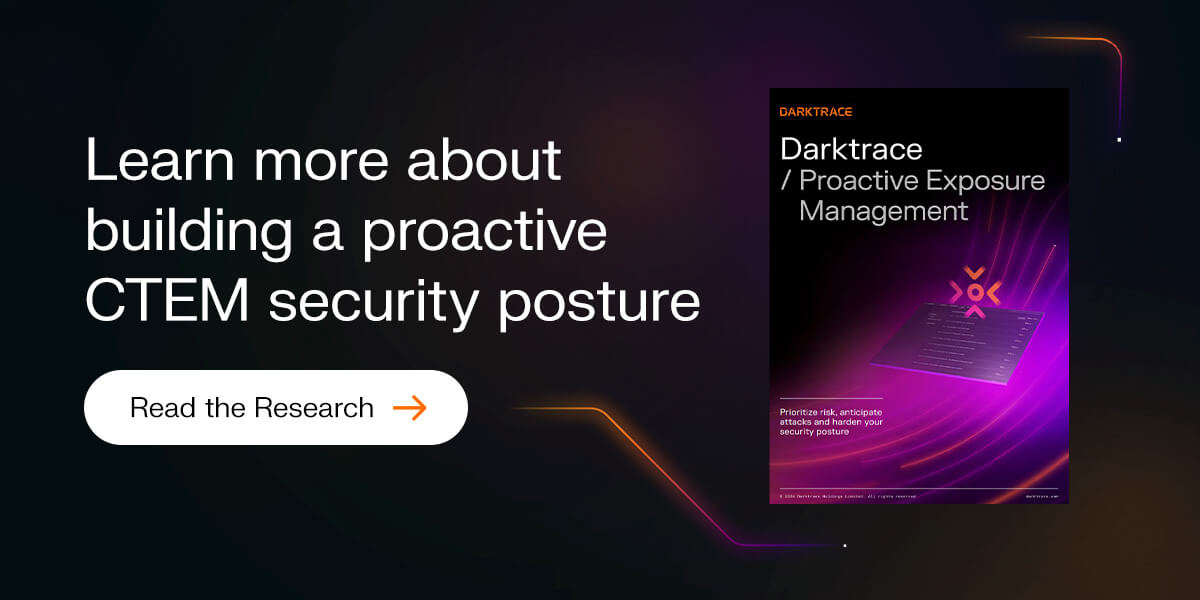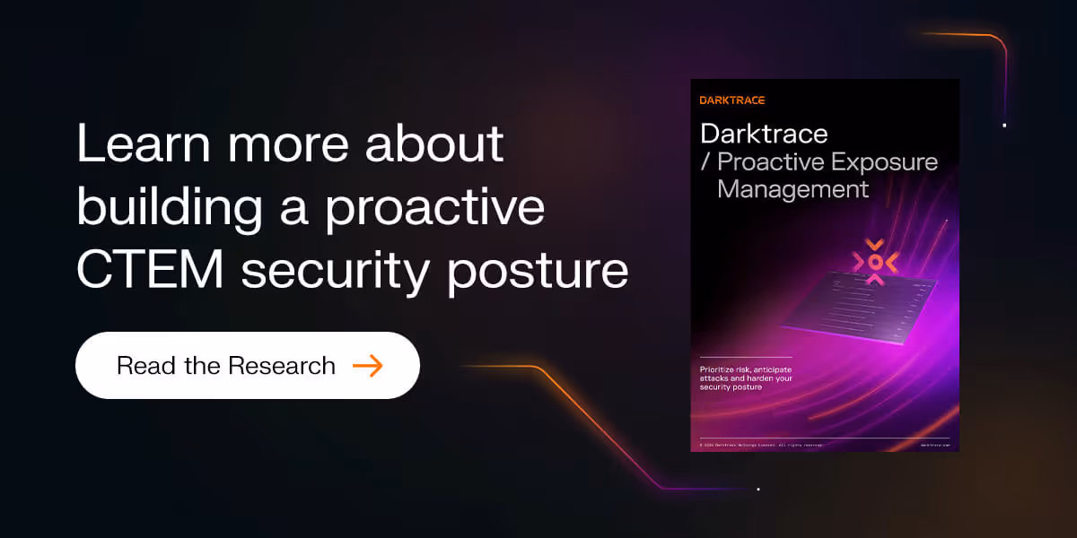 Shifting from reactive damage control to proactive exposure management is crucial to hardening your defenses against evolving attack techniques. A mature CTEM program transforms security from a blocker into a business enabler. Explore Darktrace's research on Proactive Exposure Management and Attack Surface Management™ solutions.