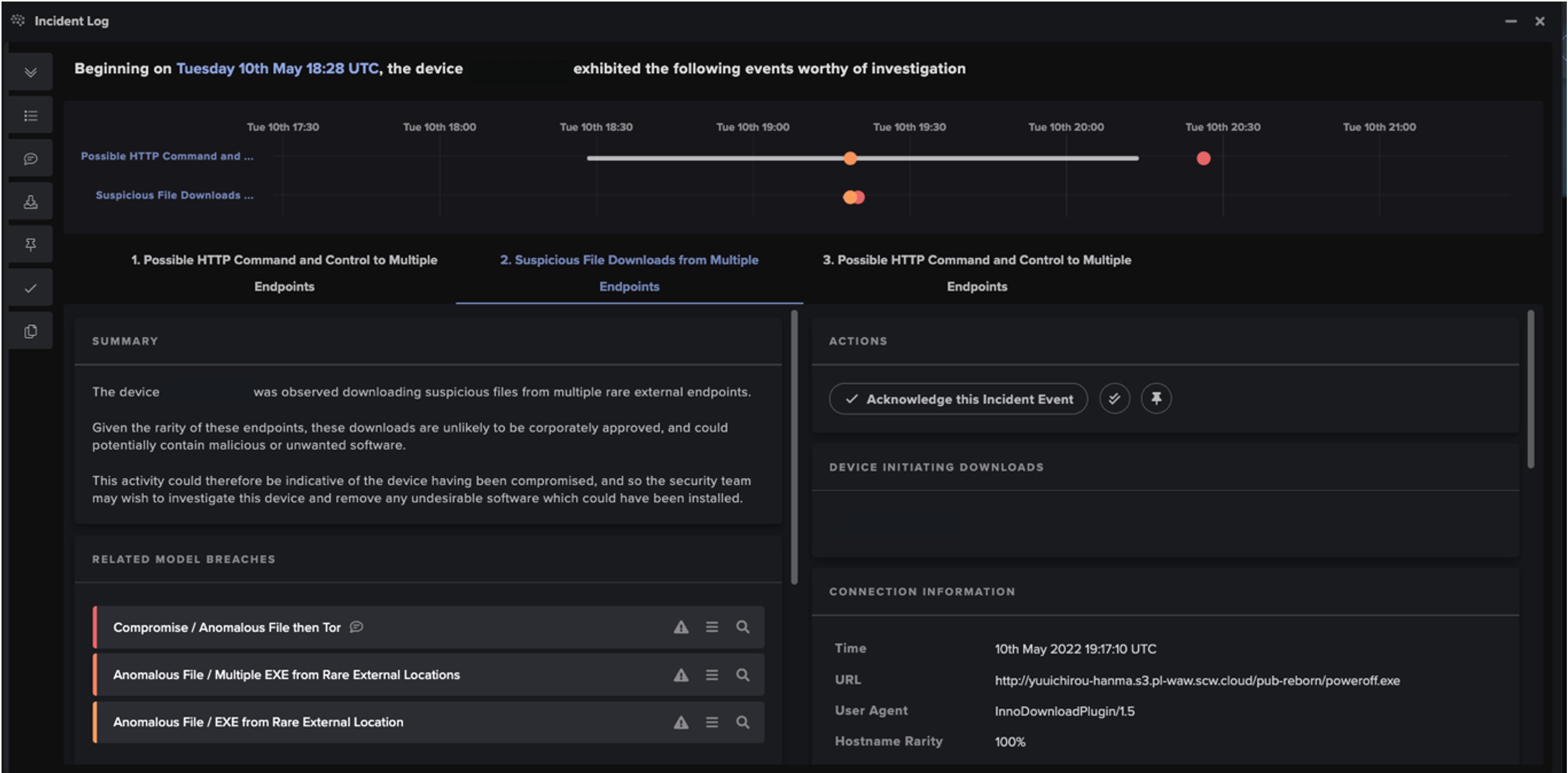 Shortly after, the device made connections to a known Tor relay node. Tor is commonly used as an avenue for C2 communication as it offers a way for attackers to anonymize and obfuscate their activity. It was at this point that the first Proactive Threat Notification (PTN) for this activity occurred. This ensured immediate follow-up investigation from Darktrace SOC and a timeline of events and impacted devices were issued to the customer’s security team directly.