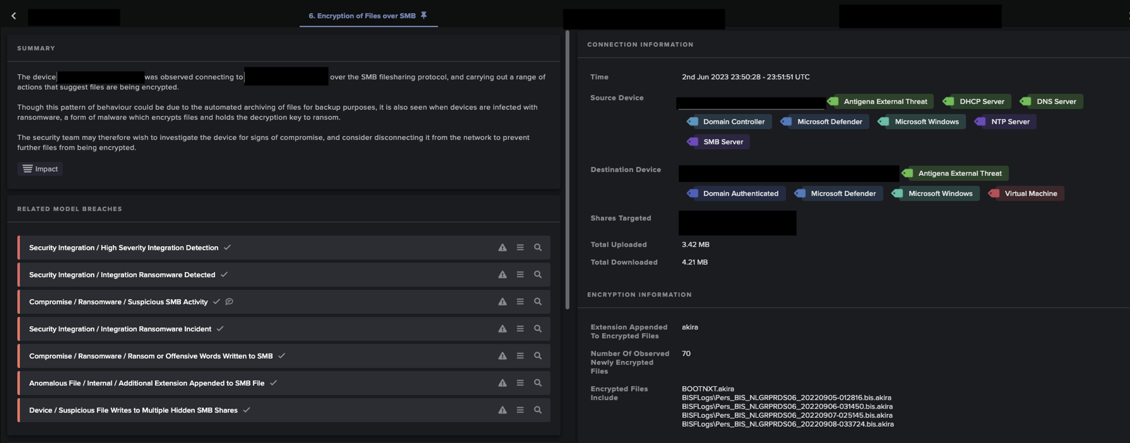 Figure 3: Darktrace Cyber AI Analyst incident correlated multiple model breaches together to show Akira ransomware encryption activity.