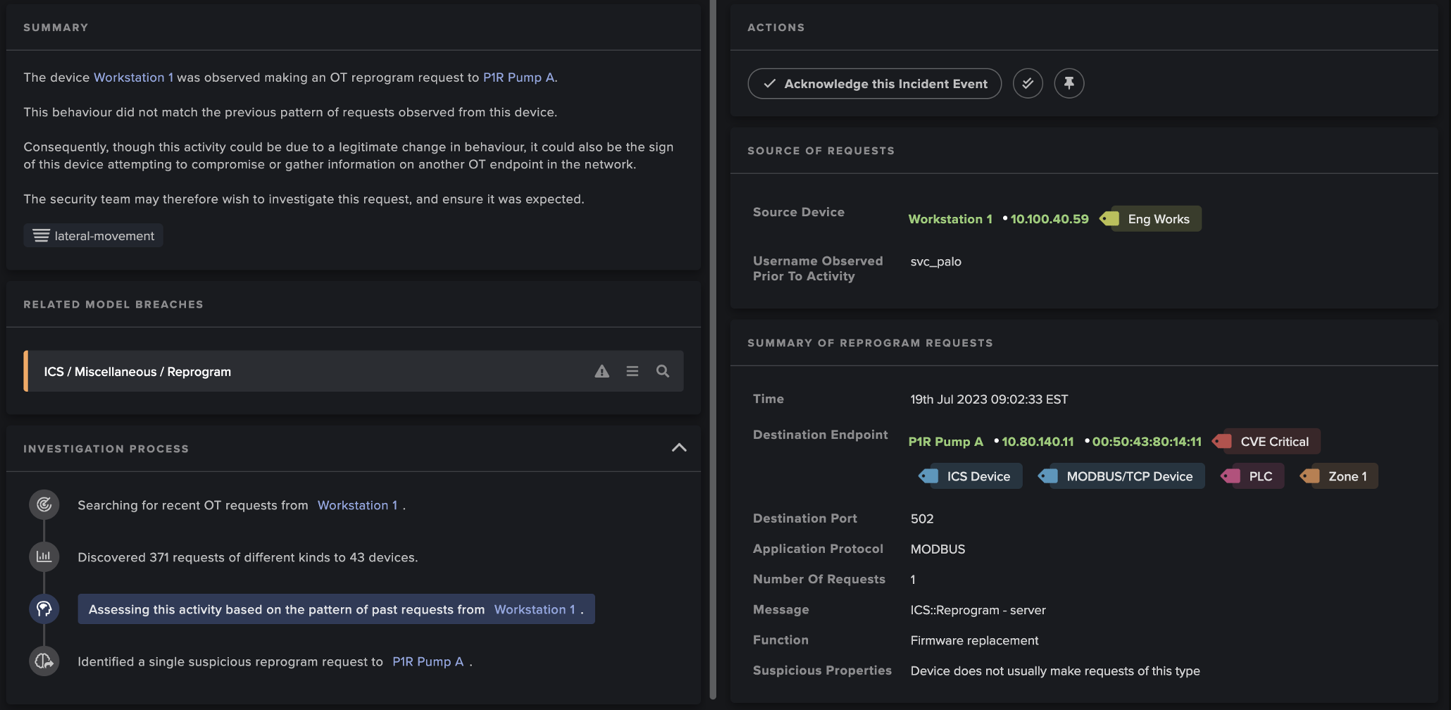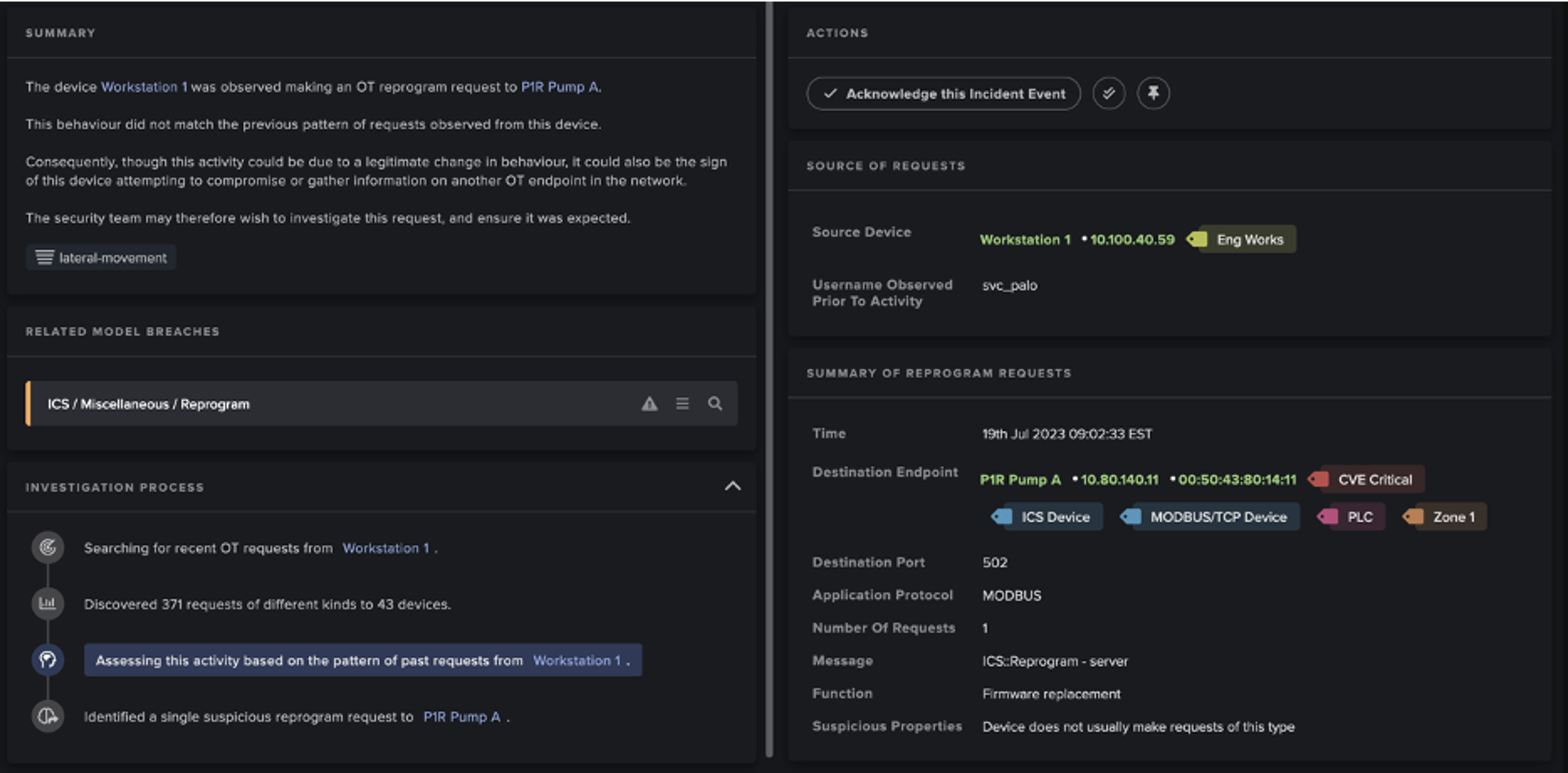 In the real-world example below, Darktrace/OT detected a subtle deviation from normal behavior when a reprogram command was sent by an engineering workstation to a PLC controlling a pump, an action an insider threat with legitimized access to OT systems would take to alter the physical process without any malware involved. In this instance, AI Analyst, Darktrace’s investigation tool that triages events to reveal the full security incident, detected the event as unusual based on multiple metrics including the source of the command, the destination device, the time of the activity, and the command itself.