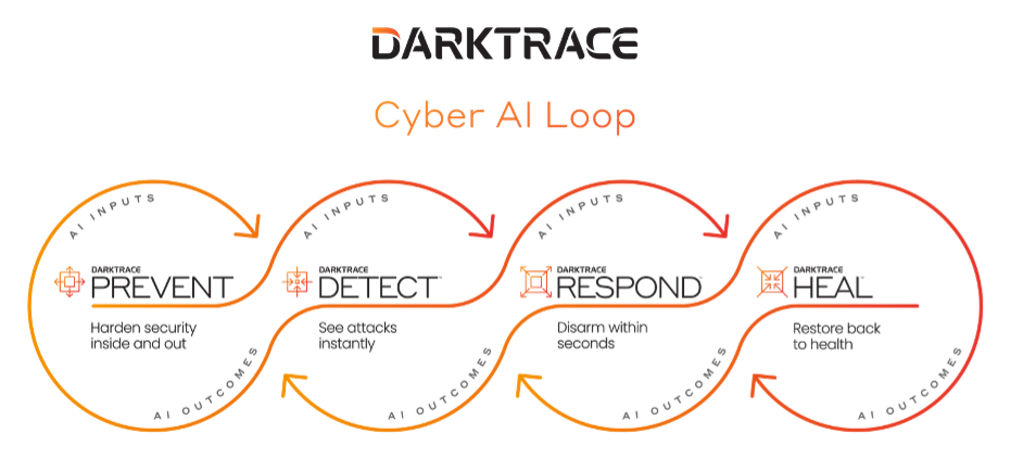The Cyber AI Loop is Darktrace’s approach to cyber security. The four product families make up a key aspect of an organization’s cyber security posture. Darktrace PREVENT, DETECT, RESPOND and HEAL each feed back into a continuous, virtuous cycle, constantly strengthening each other’s abilities.