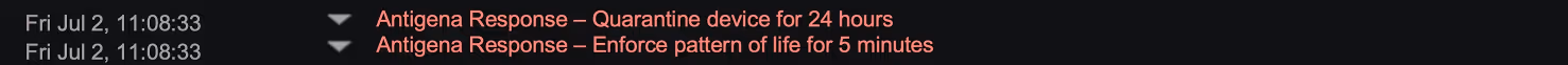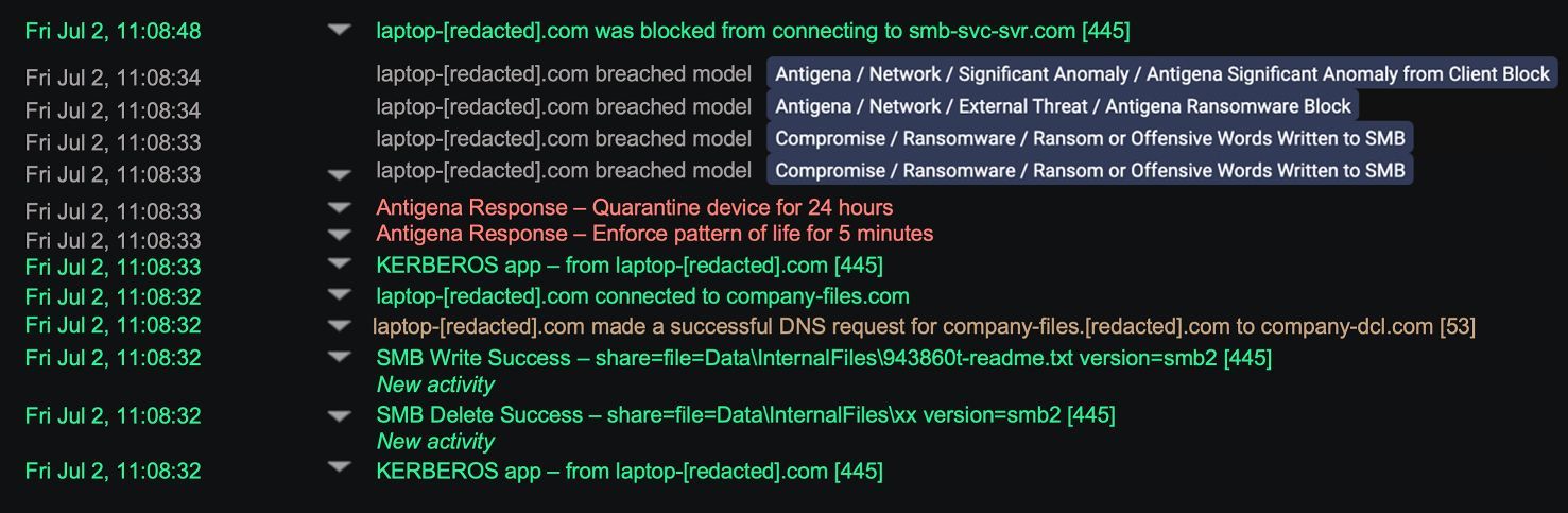 - Quarantine device for 24 hours: Usually, Antigena would not take such drastic action, but it was clear that this activity closely resembled ransomware behavior, so Antigena decided to quarantine the device on the network completely to prevent it from doing any further damage.