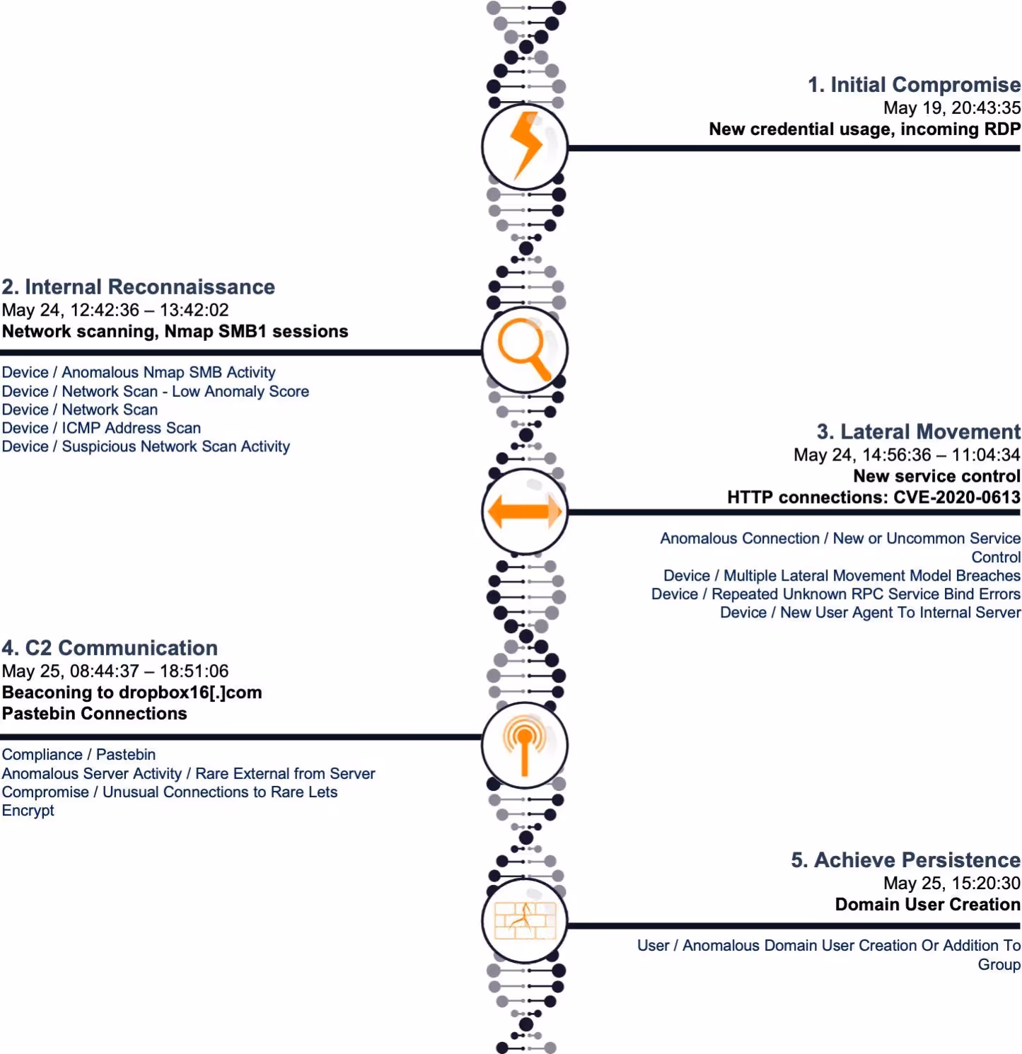 The threat story above demonstrates the importance of controlling the access granted to low-privileged credentials, as well as remaining up-to-date with security patches. Since such attacks take advantage of existing network infrastructure, it is extremely difficult to detect these anomalous connections without the use of AI.