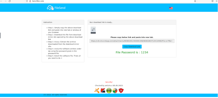 The chain of activity starts with the user’s browser being redirected to a webpage which instructs them to download a password-protected archive file from a file storage service such as Discord CDN. Discord is a popular VoIP and instant messaging service, and Discord CDN is the service’s CDN infrastructure. In several cases, the webpages to which users’ browsers were redirected were hosted on ‘hero-files[.]com’ (Figure 2), ‘qd-files[.]com’, and ‘pu-file[.]com’ (Figure 3).