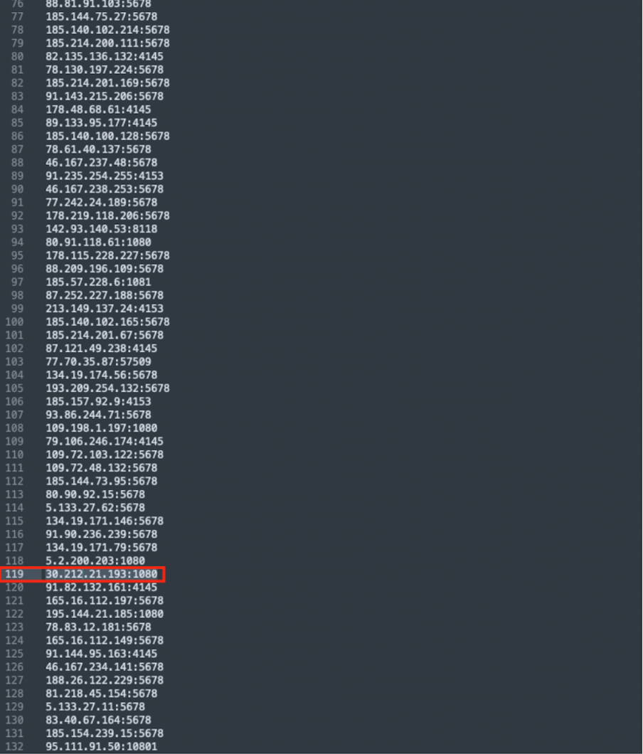 The ‘proxies.txt’ DDR hosted on 212.193.40[.]45 contains a list of 132 IP address / port pairs. The 119th line of this list includes a scrambled version of the IP address of PrivateLoader’s main C2 server (Figures 7 & 8). Prior to June, it seems that the main C2 IP address was ‘212.193.30[.]21’, however, the IP address appears to have recently changed to ‘85.202.169[.]116’. In a limited set of cases, Darktrace also observed PrivateLoader bots retrieving payload URLs from 2.56.56[.]126 and 2.56.59[.]42 (rather than from 212.193.30[.]21 or 85.202.169[.]116). These IP addresses may be hardcoded secondary C2 address which PrivateLoader bots use in cases where they are unable to retrieve the primary C2 address from Pastebin, 212.193.30[.]45 or 45.144.255[.]57 [10].