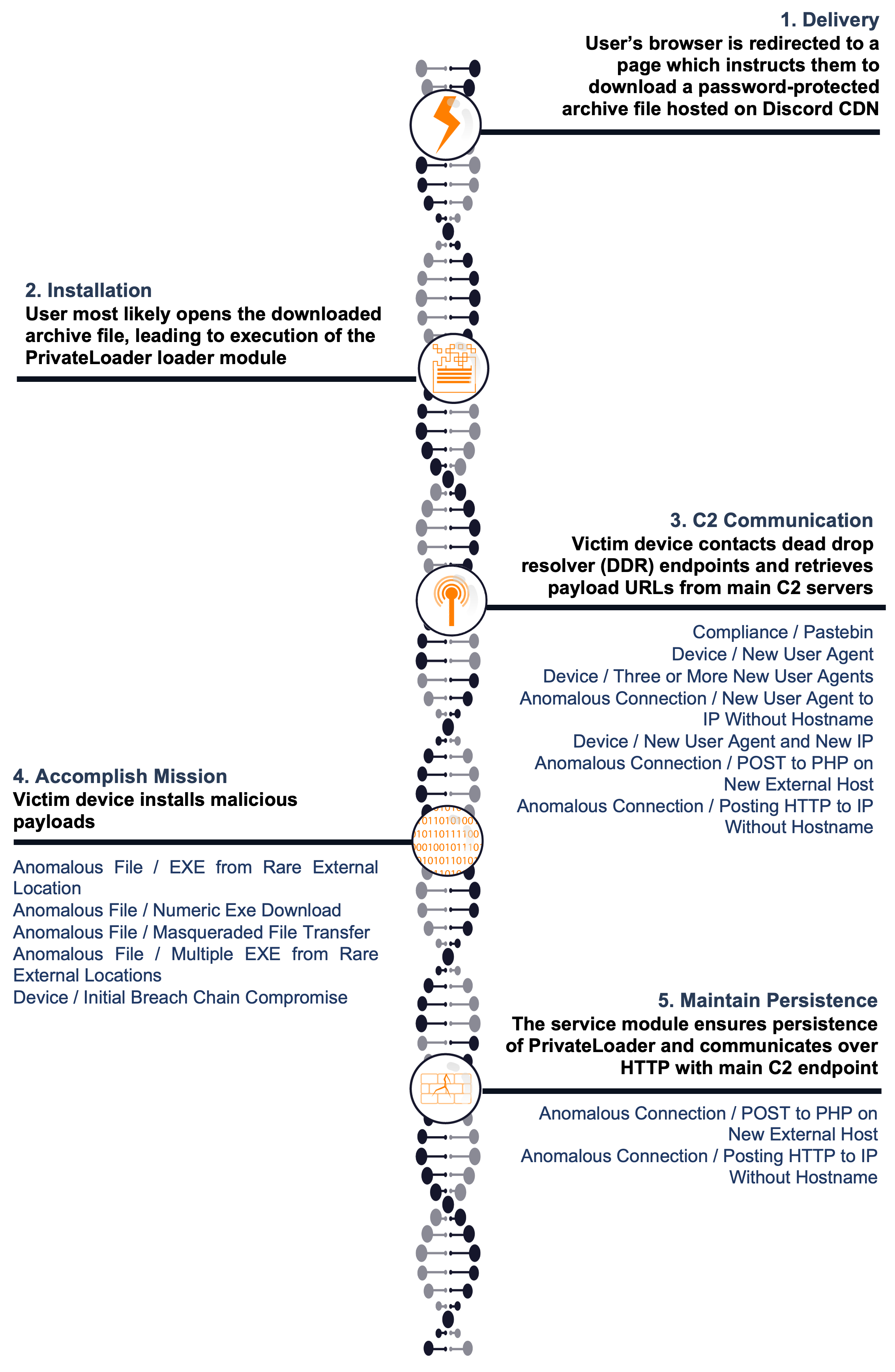 Between January and June 2022, Darktrace identified the following sequence of network behaviours within the environments of several Darktrace clients. Patterns of activity involving these steps are paradigmatic examples of PrivateLoader activity: