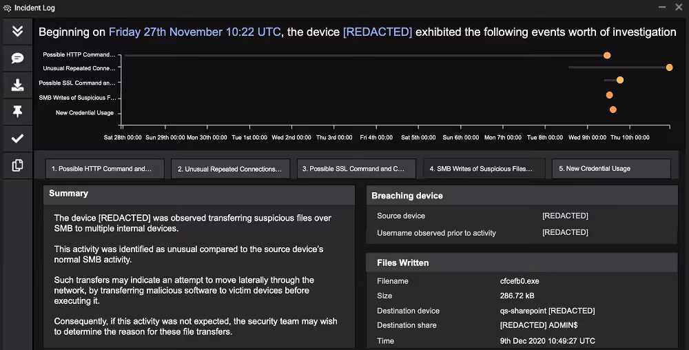 Figure 2: Cyber AI Analyst triaged and reported on the malicious activity from the device, surfacing useful metrics and natural language summaries for each stage of the kill chain.