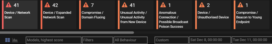 Not only was this activity readily apparent from the bird’s-eye perspective shown above, the detonating devices also created the highest-priority Darktrace alerts over a several day period: “Device / Network Scan” and “Device / Expanded Network Scan”: