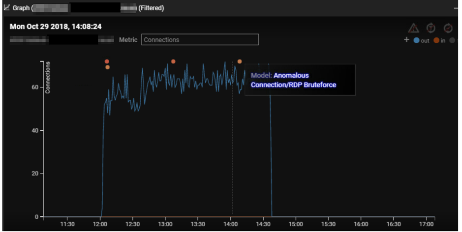 A clear plateau in increased internal connections (blue) can be seen. Every colored dot on top represents an RDP brute force detection. This was again a clear-cut detection not drowned in other noise — these were the only RDP brute force detections for a several-month monitoring time window.