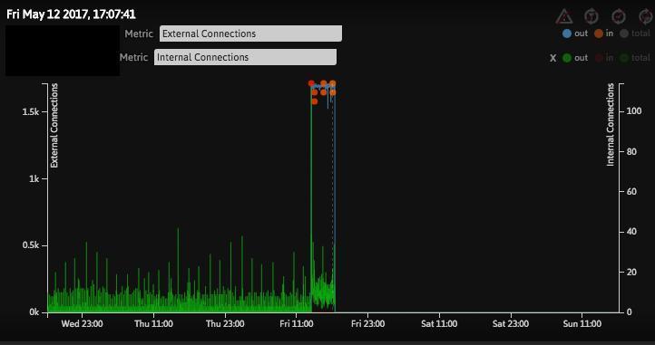 • External and internal connections by one of the network devices 48 hours either side of the WannaCry campaign. Every orange dot represents a model breach.