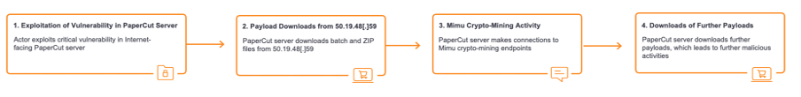 These facts suggest that the actor behind the 50.19.48[.]59 chains were seeking to drop cryptocurrency miners on PaperCut servers, with the intention of abusing the customer’s network to carry out resource intensive and costly cryptocurrency mining activity. Meanwhile, the actors behind the 192.184.35[.]216 chains were likely attempting to establish a Tor-based C2 channel with PaperCut servers to allow actors to further communicate with compromised devices.