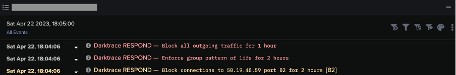 Darktrace RESPOND™ was not active in any of the networks affected by 192.184.35[.]216 activity, however, RESPOND was active in some of the networks affected by 50.19.48[.]59 activity. In those environments where RESPOND was enabled in autonomous mode, observed malicious activities resulted in intervention from RESPOND, including autonomous actions like blocking connections to specific external endpoints, blocking all outgoing traffic, and restricting affected devices to a pre-established pattern of behavior.